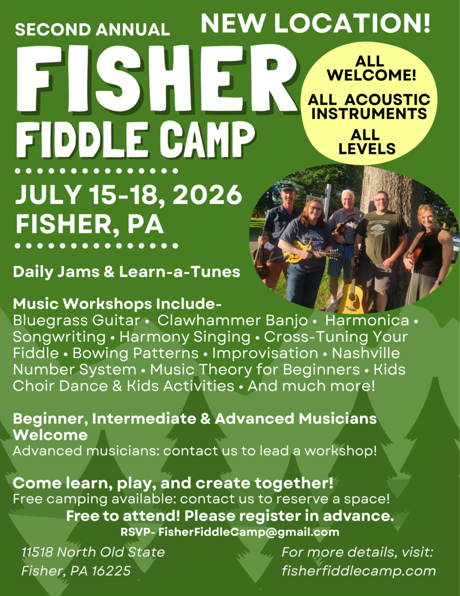 The Fisher Fiddle Camp is a four day experience and festival for musicians of all levels and spectators of all ages who enjoy traditional bluegrass, including genres like old-time, Irish, and Celtic music. The new location features open fields, a large barn, farmhouse gathering spaces, and on-site camping, creating an immersive setting for a full week of music. Spectators are welcome each evening for jam sessions, with the festival culminating on Saturday, July 18th with performances all day long, so bring your camping chairs! Food trucks will be on site. The landscape will charm you as much as the music!